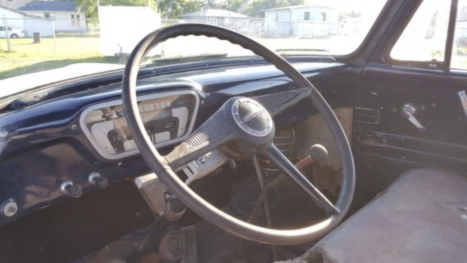 The interior looks pretty good considering the condition of the exterior. There is still a shine in the royal blue paint on the dash, and the instrument cluster looks great. Under the dash is a very nice heater with chrome trim, and an aftermarket turn signal is attached to the steering column. The seats are not surprisingly worn and will, of course, need new covers, but the knobs, handles and plastic steering wheel are in great shape.