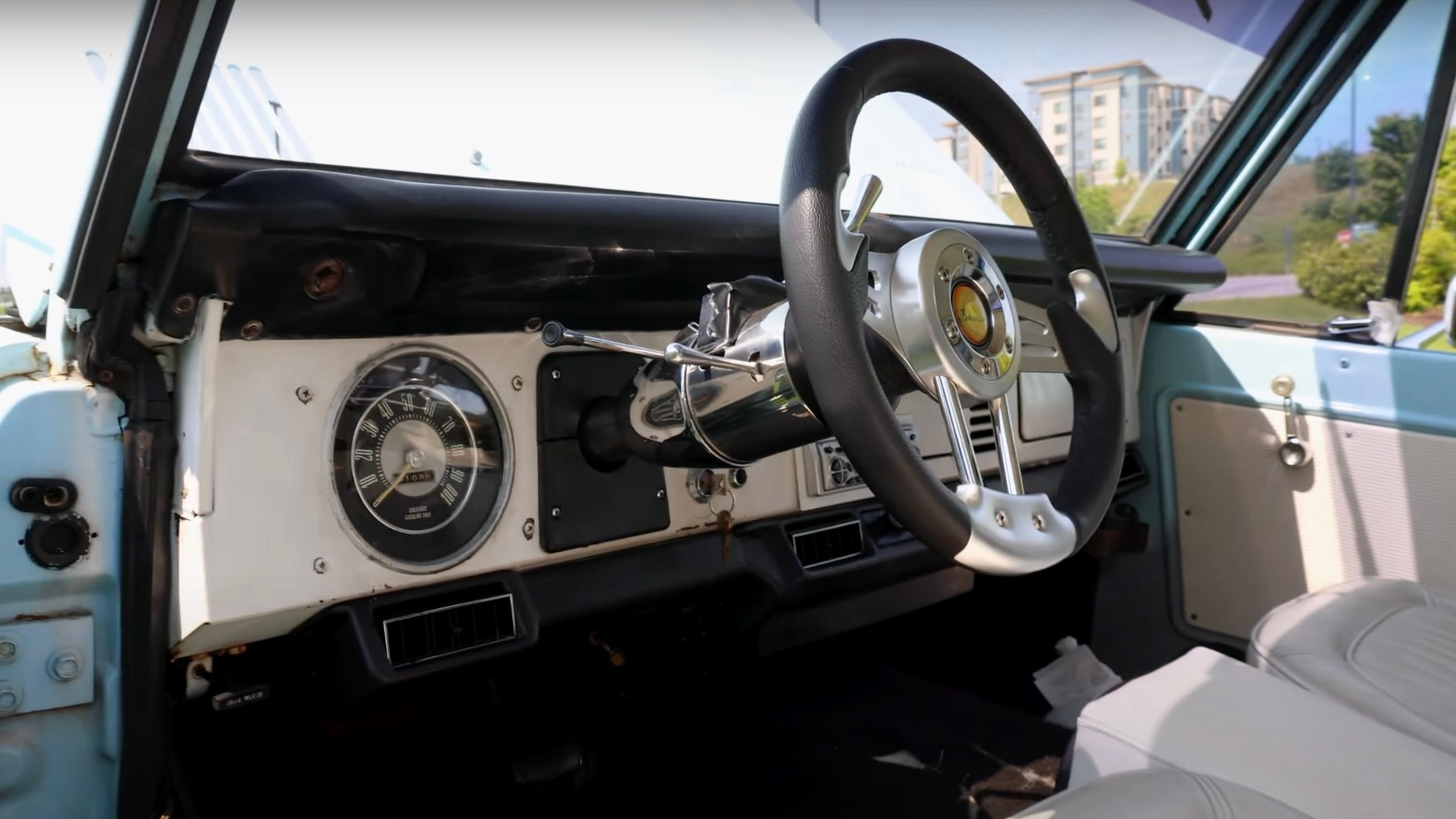 On the outside, the original light blue paint remains intact, though the owner isn't sure if it's been resprayed at some point over the years. There are some flaws and a little patina as one might expect, but nothing that detracts from how cool this Bronco half-cab truly is - in fact, it may even make it better.