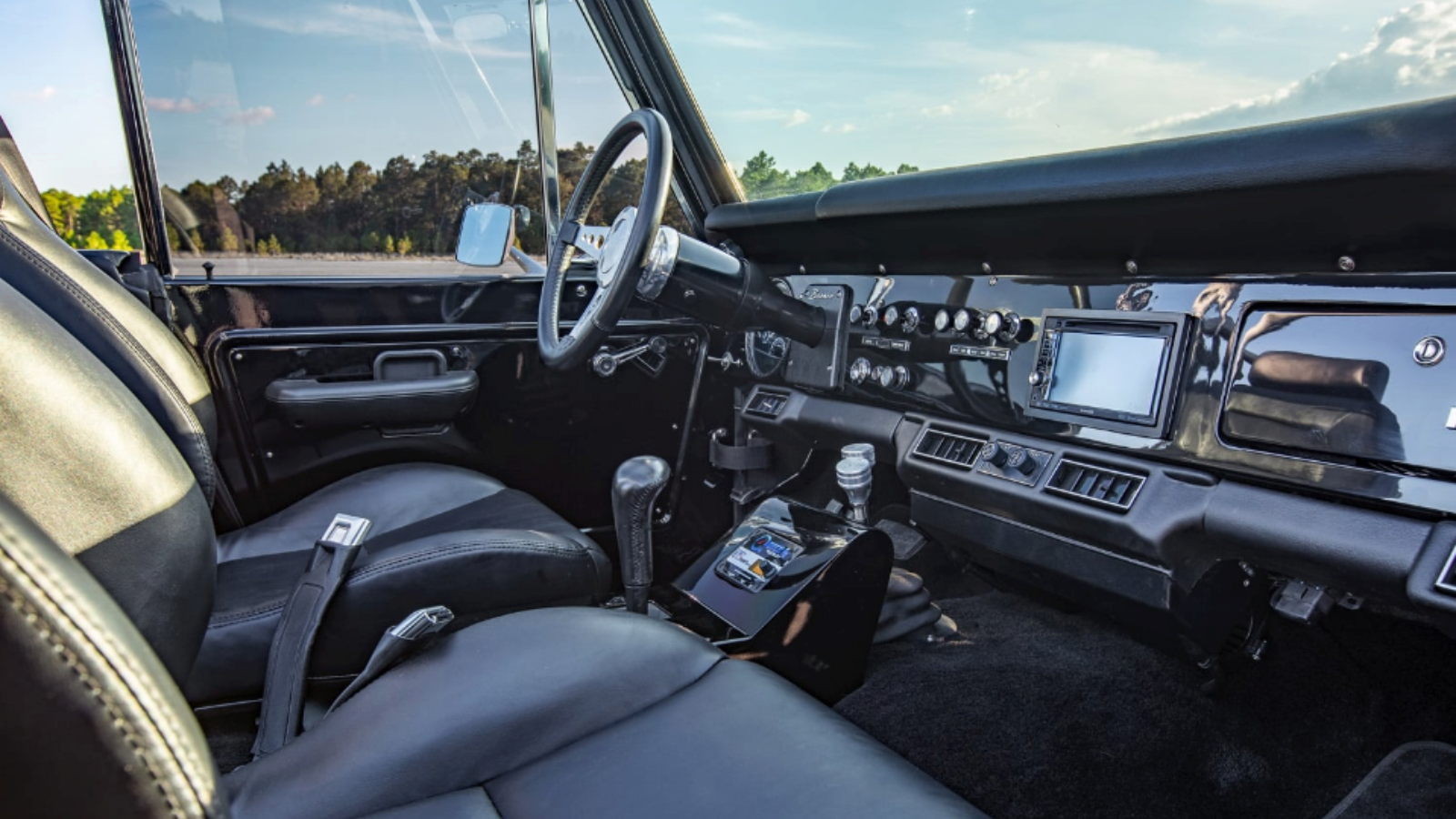 This Bronco’s Ford Coyote 5.0 engine has been completely rebuilt and paired with a 4R70 4-speed transmission, a custom-built serpentine system that barks through a 3” performance exhaust. As many automotive specialists know, when vehicles sit for decades, wiring is often the first to suffer. Velocity has taken care of that problem with a complete restoration of the vehicle’s electronics —along with the implementation of some cool contemporary entertainment and climate systems.