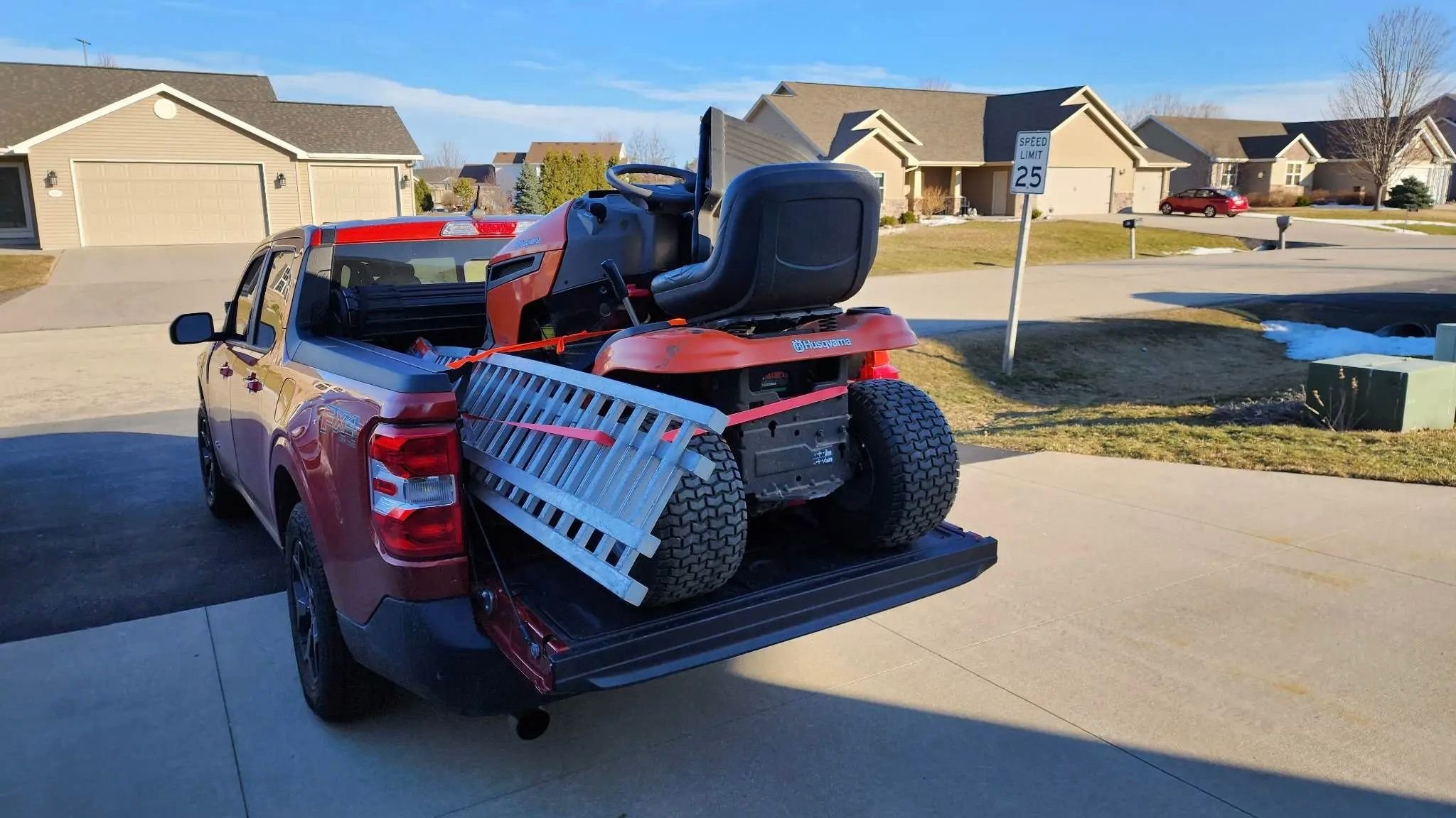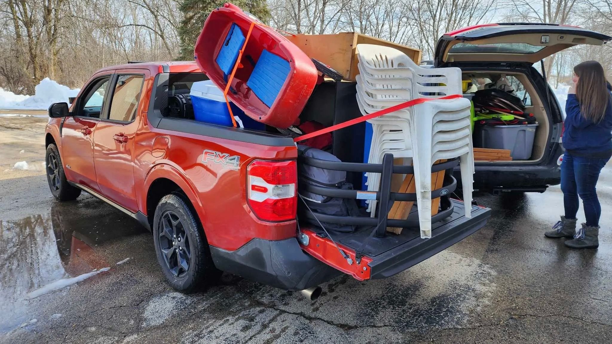 The Maverick has also been used to haul a riding lawnmower, giant boxes, and pretty much anything else one can imagine, as we can see in the photos that Cummings has taken of his many adventures. "I call it my little mule," he said. "It works perfectly fine for what I need. It's a truck. I use it like a truck. I commute 26 miles to work so I wanted something good on gas and versatile. I do have a restored 1970 F-250 I can use for the big stuff."