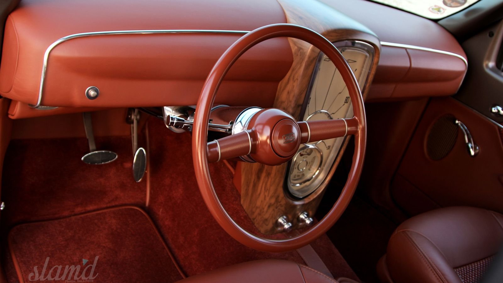 Entering the interior is like stepping into a different world. Recovery Room Hot Rod Interiors is responsible for the mastery here, and it does indeed incorporate Rolls Royce inspiration—the carpet is made after Rolls patterns. The modified seats are out of a VW Passat, and they and most of the rest of the interior were bathed in a richly-colored hide. The gauges were all custom-designed and the gauge cluster isn’t actually wood but in fact an airbrushed job by Brad Starks of Brad Starks Rod and Customs.