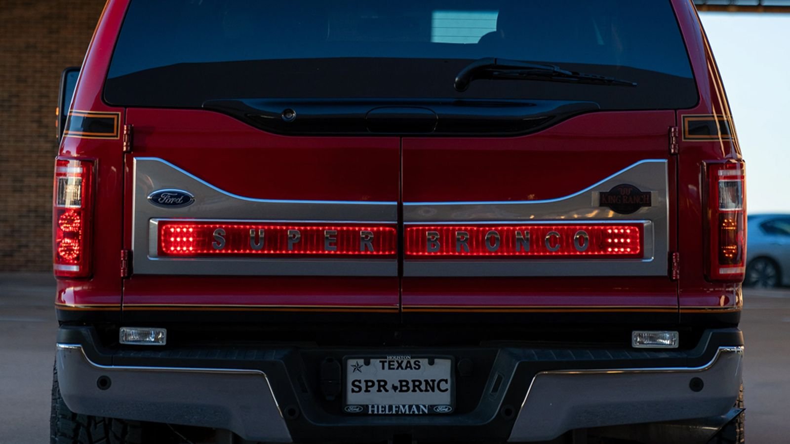 A King Ranch rear insert is lit up here and gives the Excursion rear-end a fresh update. Just another detail that gives this build its one-off feel. It features a cleanly lit panel that sets off custom "Super Bronco" lettering.