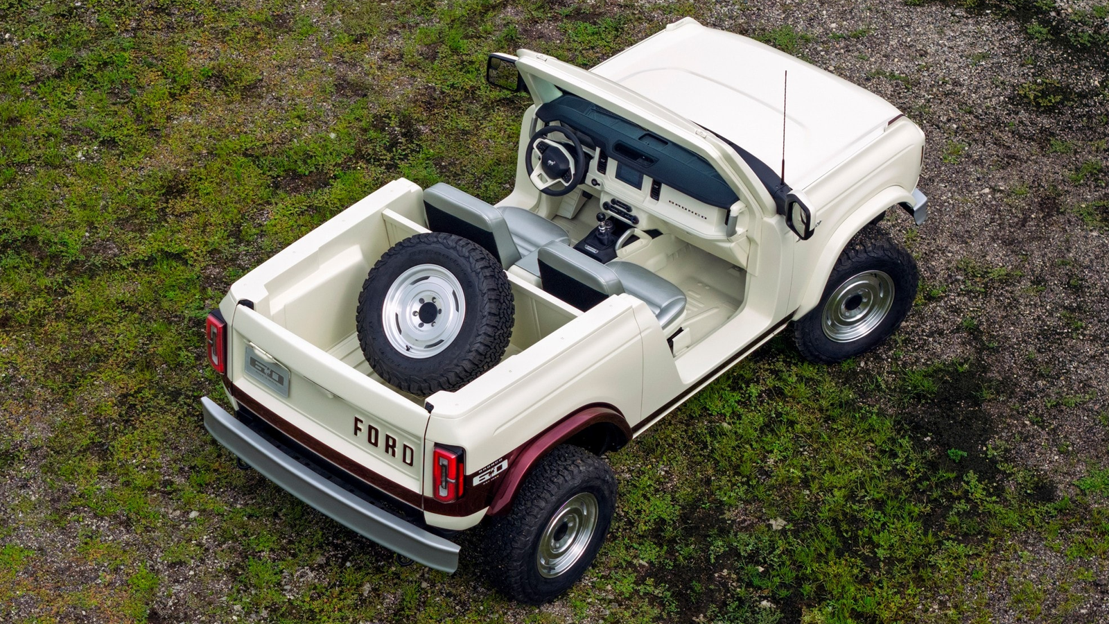 Painted in Wimbledon White, the Bronco Roadster Concept draws directly from a preserved 1966 roadster owned by a member of Ford’s development team. The design rejects contemporary SUV trends in favor of minimalism: no roof, no B-pillars, and no rear seating. The interior is pared down to two silver leather jump seats with lap belts, a manual shifter, and just two cupholders. The rear cargo area is intentionally utilitarian, echoing the original U13’s layout.