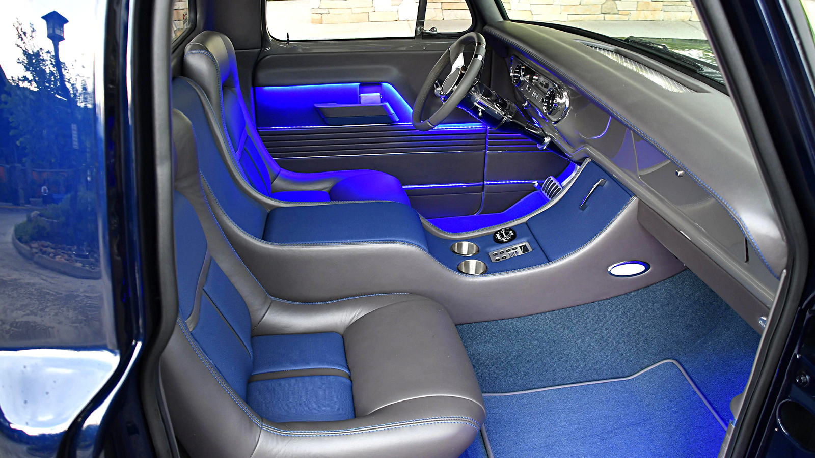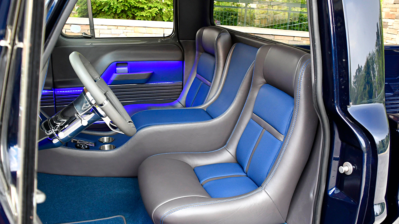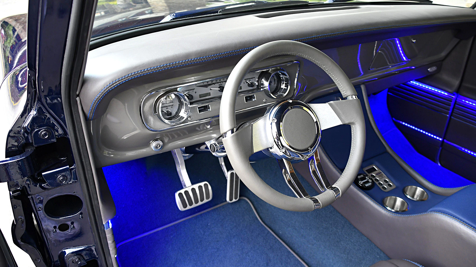 The luxurious custom interior is quite the opposite of what you'd find in a race car/truck. Supple leather covers just about everything, and there are a plethora of Dakota Digital gauges stuffed in a '64 Falcon panel.