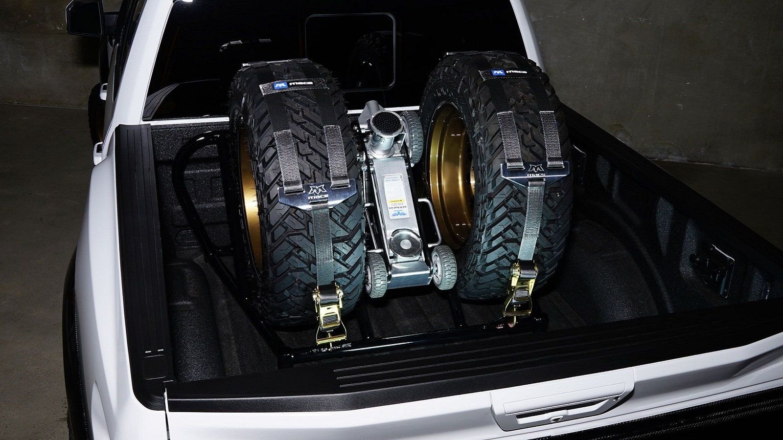 Just take a look at the bed if you want further proof. In both the white and the black truck, you'll find a pair of full-size spares and a jack. But instead of using some off the shelf rack, MAD fabricated an attractive custom piece that can handle the rigors of off-roading. Not just rolling in and out of some convention center.