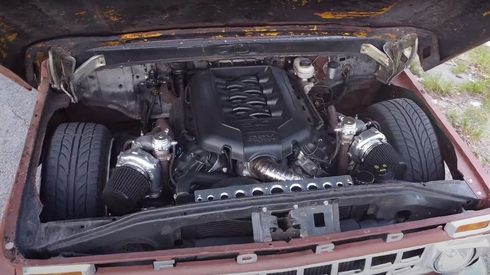 The owner settled on a first-gen 5.0-liter Coyote V8 from a 2012 Mustang GT, which is a popular choice these days. To that, he added a pair of Magnum 60 turbos, which are capable of helping the motor make 600 horsepower on a mere 8 pounds of boost. Obviously, the turbos can be turned up to generate a whole lot of extra power, but in its current form, the Coyote is more than capable of lighting up the rear tires.