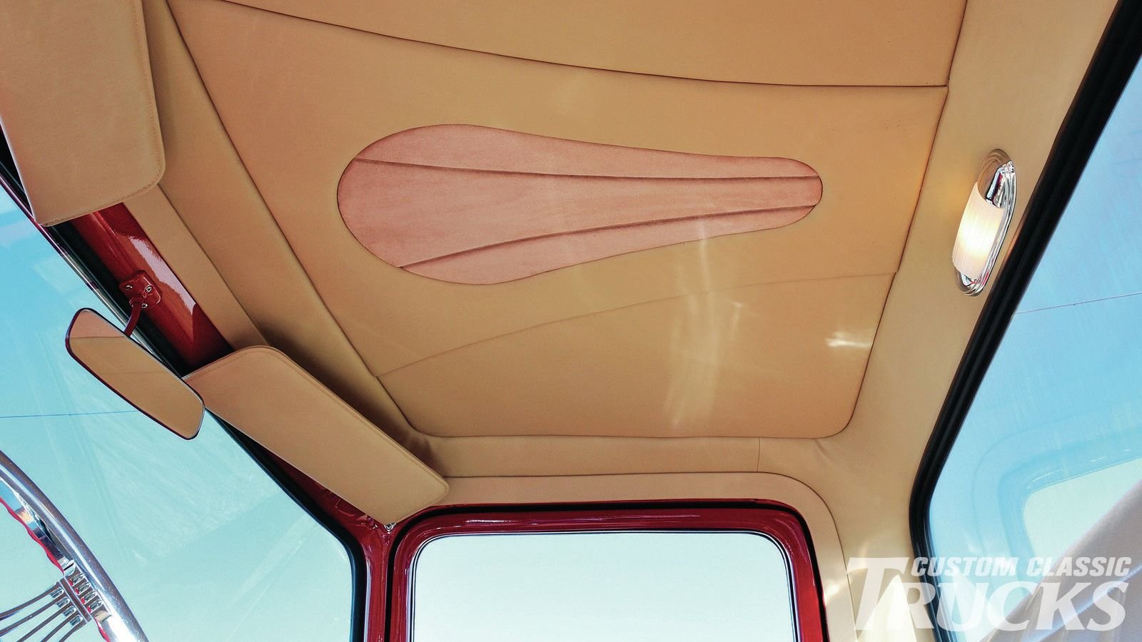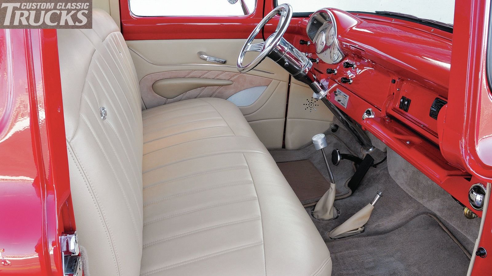 Kelly insisted on genuine leather for the truck's interior, choosing Scott’s Pro Upholstery in Jacksonville to do the honors. Scott's recovered the factory bench seat in Desert Tan hide, cutting a custom headliner and door panels out of the same material. A Banjo steering wheel juts out from under the body-color dash, which holds a set of Dolphin gauges, and sits above the Lokar shifter and No Limit pedals. Kelly reports the '56 gets plenty of use showing and cruising around Florida. We're sure his son and brother get occasional turns behind the wheel as well—six years of help should buy a person a burnout as well as some bragging rights.