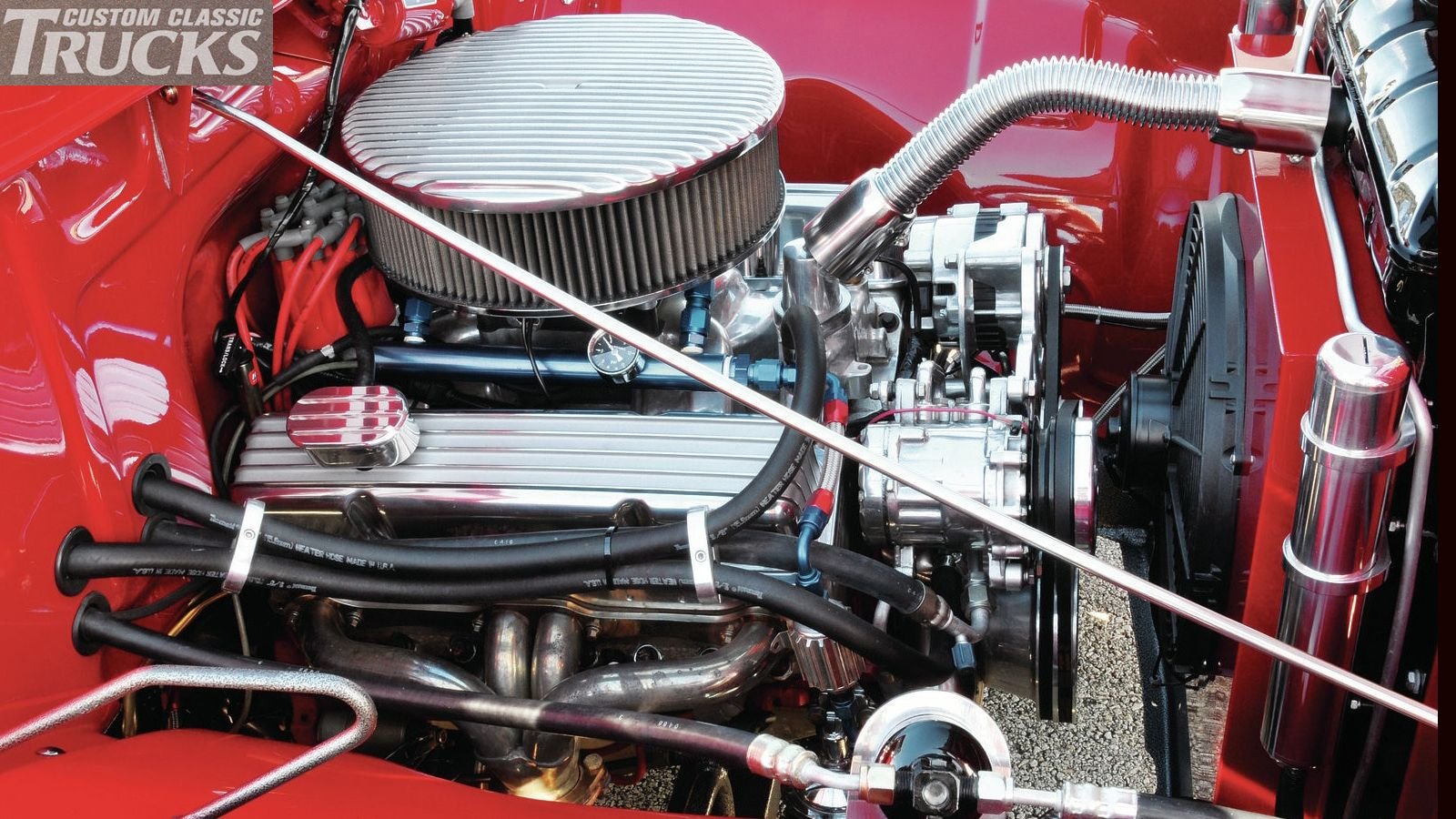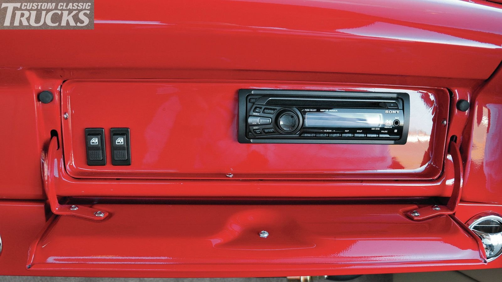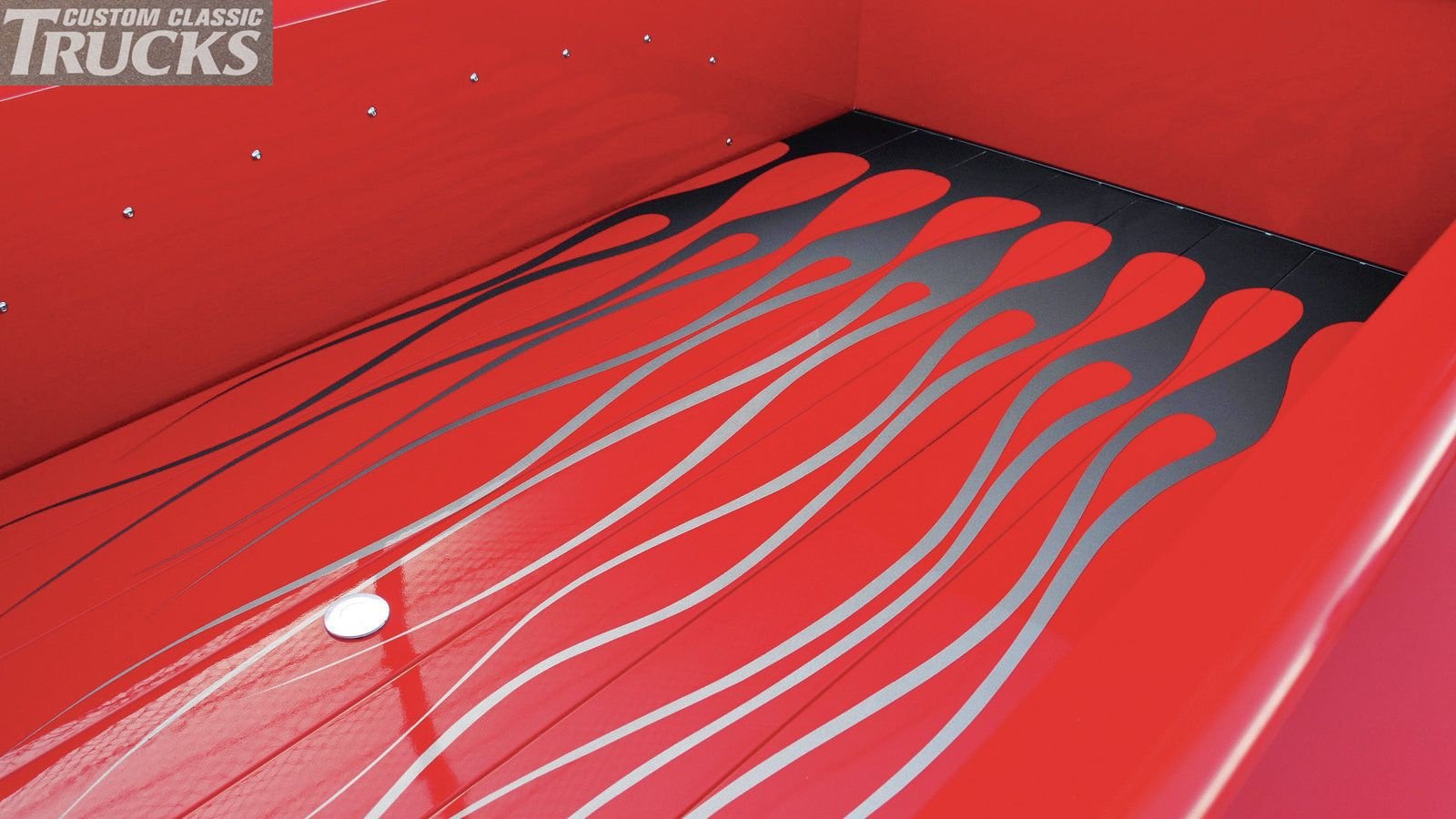 The Kellys were also working on the body along with the mechanical work. They debadged much of the exterior to let the F-100's classic lines shine through and replaced the original bumpers with curved chrome slabs. The bed was smoothed by removing the wood-and-steel-trim bed, replacing it with painted steel strips, and welding up every unneeded hole. We might have opted not to go with silver flames for the bed floor on such a clean truck, but sometimes, a few pieces of flair can spice up a uniform. The doors now sport one-piece windows, and the truck was painted panel by panel in a stunning DuPont Salsa Red by all three Kellys in Sam's garage.