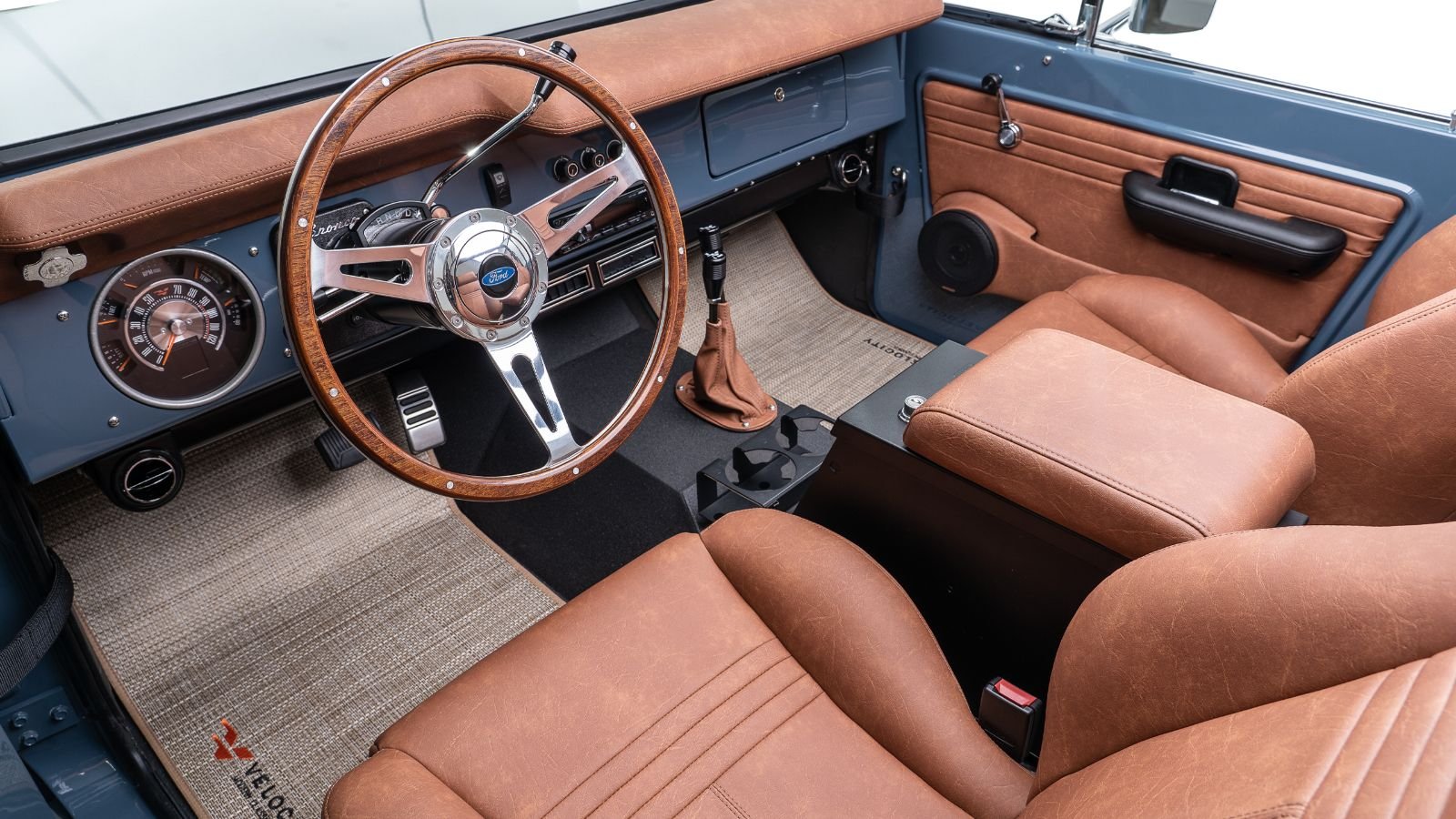 This build shows incredible attention to detail with meticulous touches throughout the cabin. The interior is awash in tan leather, showcasing Velocity's prowess at making bespoke seats, center console, and dash. Their own brand of gauges, seats, and floor trim can't easily be replicated.