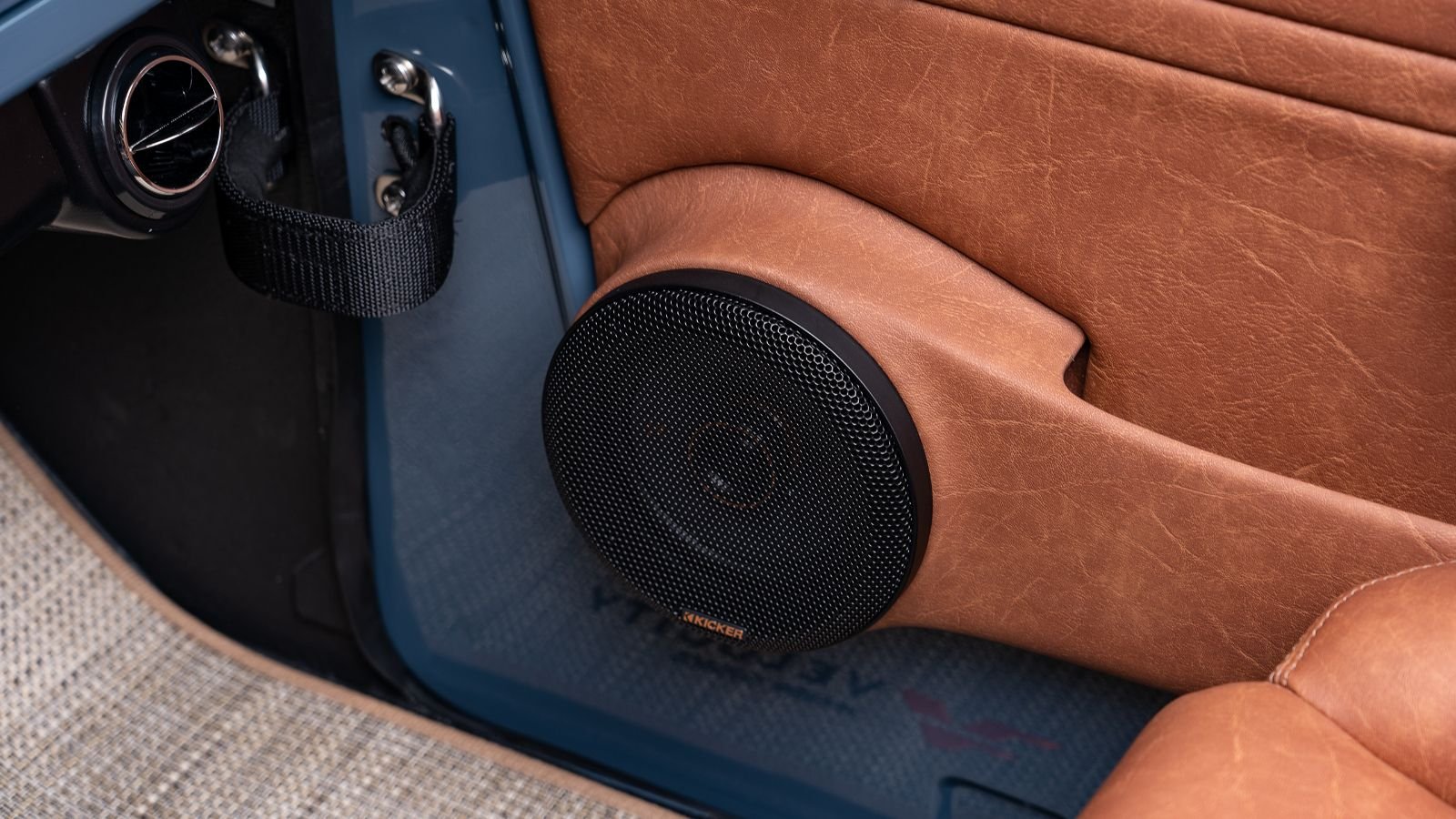 In an open-top 4x4, audio comes from all directions. Velocity chose to build door panels that capture the essence of the late 60's styling along with a solid enclosure for Kicker 6.5" speakers. A powered 10" box has been integrated with the passenger seat, so Rock On! Check out the Vintage Air kick panel vents, keep your toes cool!