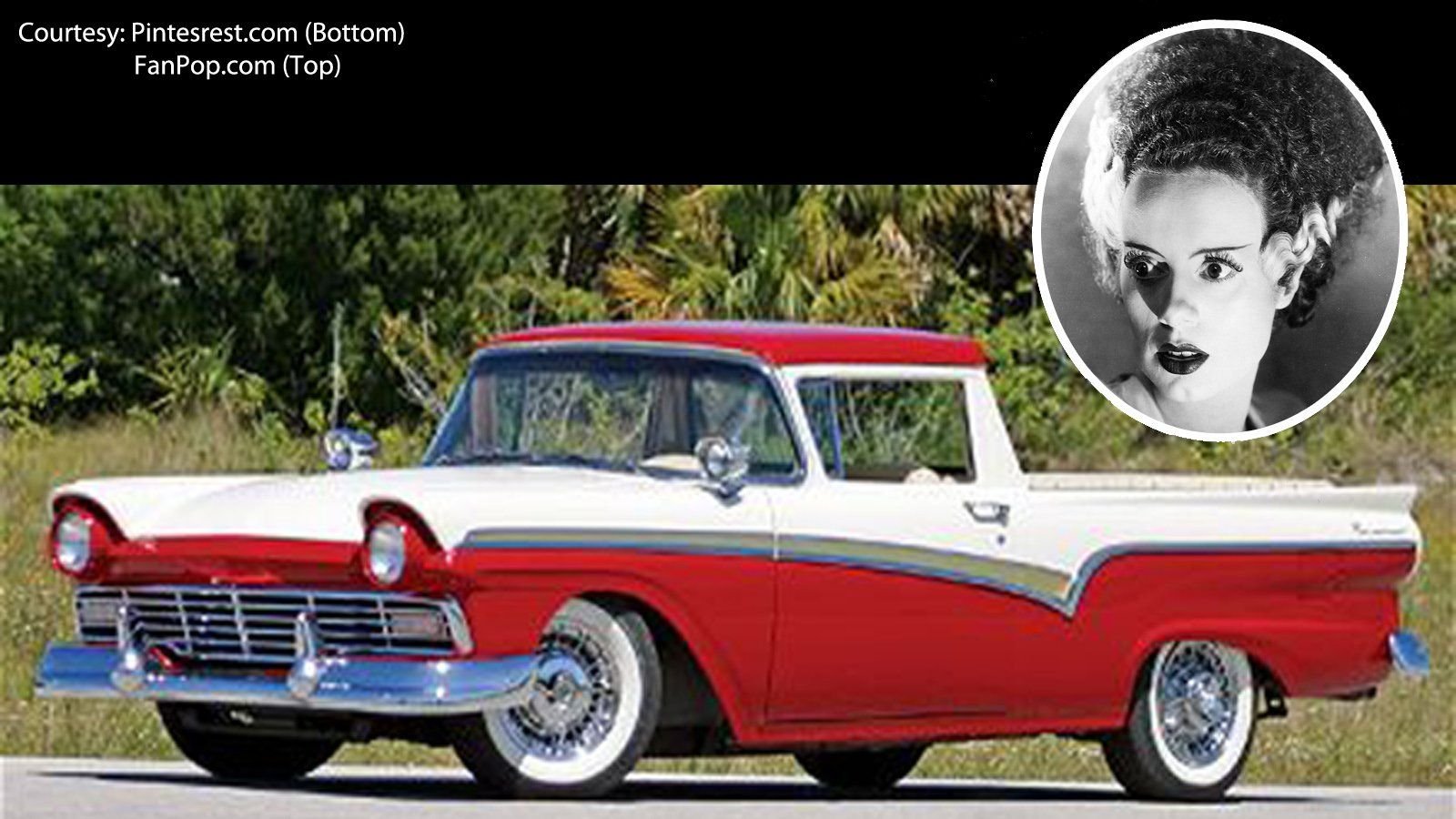 Most likely driving the opposite direction (as an independent woman) is the bride of Frankenstein's monster in a 1950's Ford Ranchero. You are probably wondering, "that is a strange choice," but something about this car screams her style. Besides, it does kind of resemble the 1960's Ford Thunderbird, and we all know what two ladies made that model popular. She might need to take the top off and turn it into a convertible for her hair to stick out in the wind.