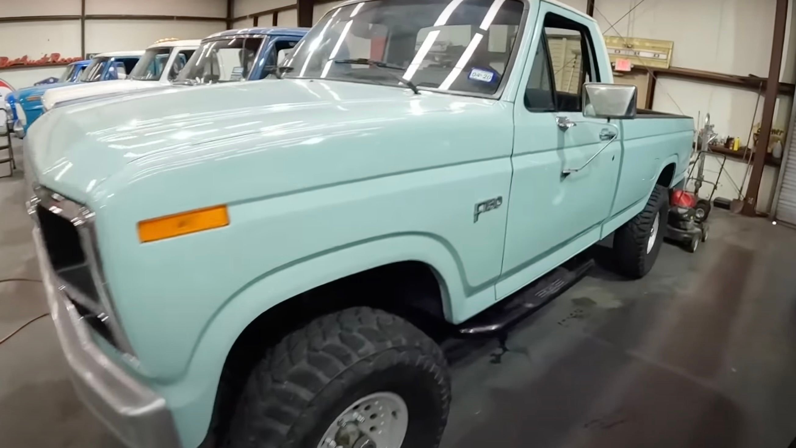 That collection includes a dark blue 1977 SuperCrew pickup with 87,000 original miles, though it has been repainted once. It's joined by a very nice 1981 F-150 that's equipped with a lighter blue hue, four-wheel-drive, and a pretty basic interior featuring rubber floor mats.