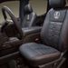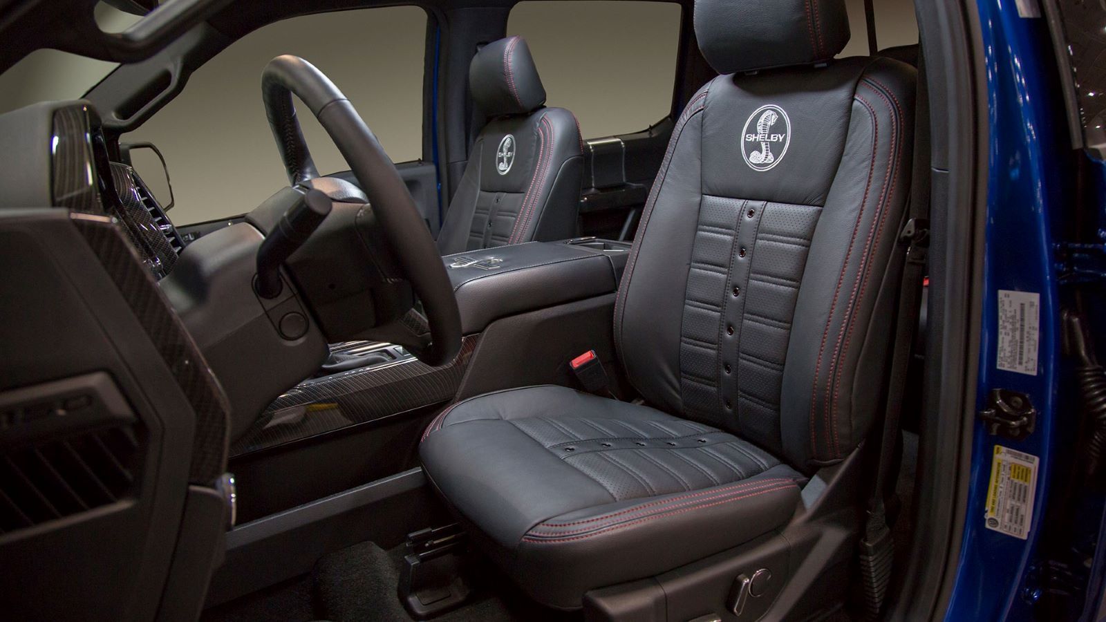 The interior of the Shelby F-150 is something special as well. There you'll find custom leather-covered seats with snake logos, a carbon fiber interior package, individually numbered dash plaque, and Shelby badges on the headrests, center console, and floor mats.